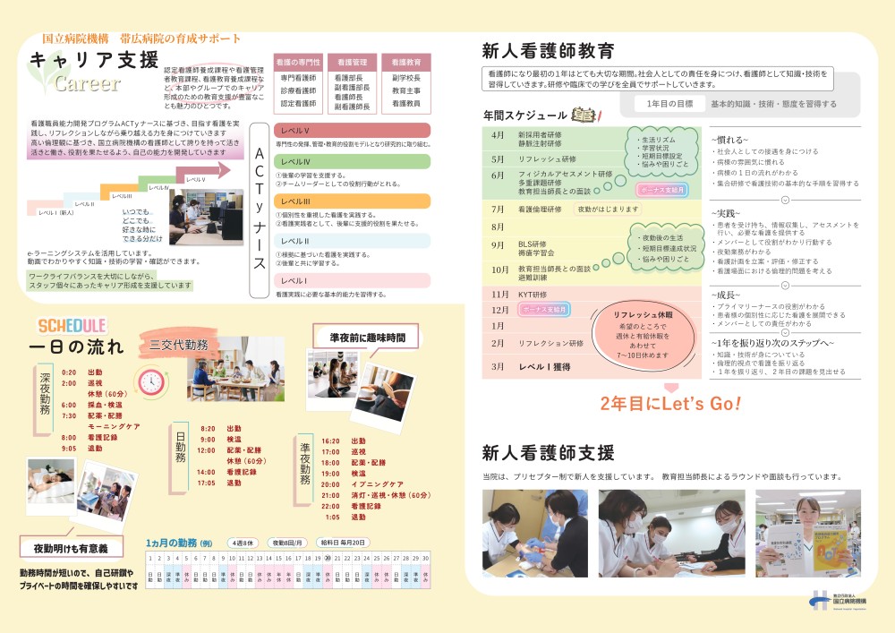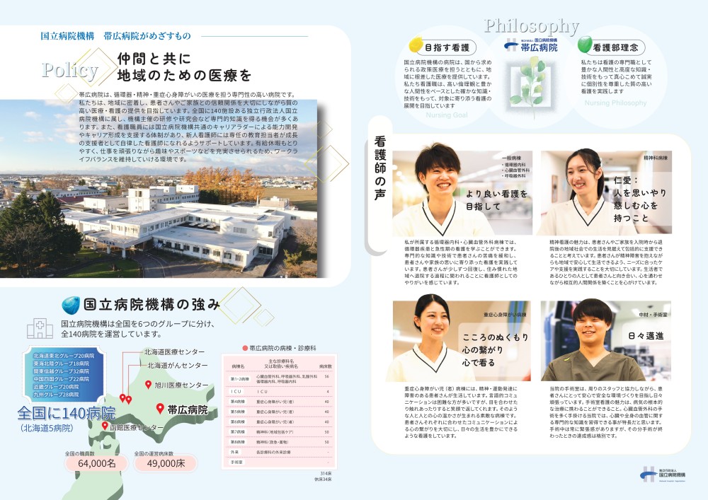 国立病院機構帯広病院 看護部の魅力を紹介するパンフレットが完成しました。 看護師のリアルな声や、働きやすい環境について詳しく掲載しています。 令和8年4月採用の看護師募集も実施中です。 ぜひご覧ください。 カテゴリ お知らせ 更新日 2026-01-05